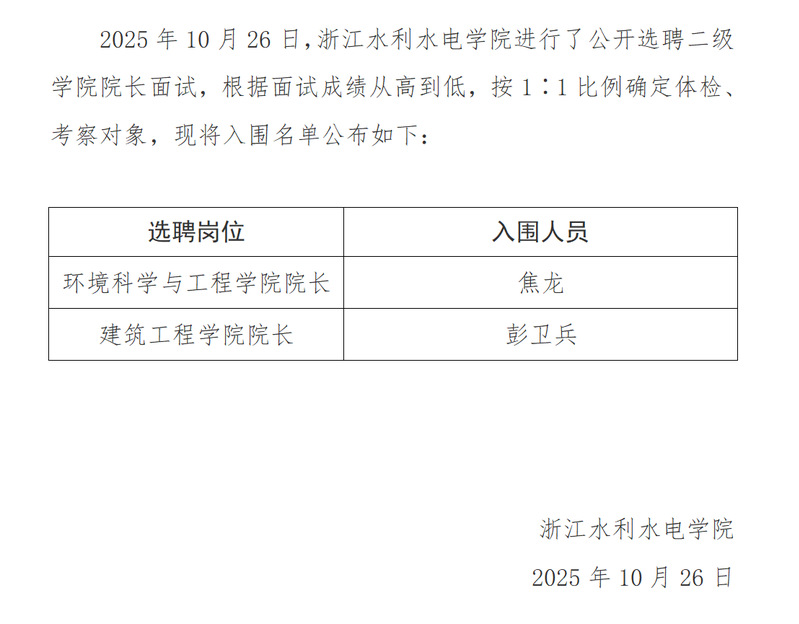 浙江水利水电学院公开选聘二级学院院长面试结果公告