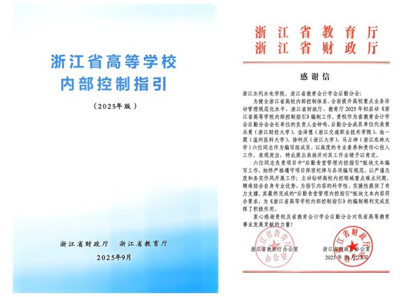 近日,《浙江省高等学校内部控制指引(2025年版)》发布会在浙江工业大学举行。会上,浙江省教育厅、浙江省财政厅向我校发来感谢信,对我校及省教育会计学会后勤分会参与《浙江省高等学校内部控制指引(2025年版)》编写工作的突出表现予以高度赞扬和肯定。