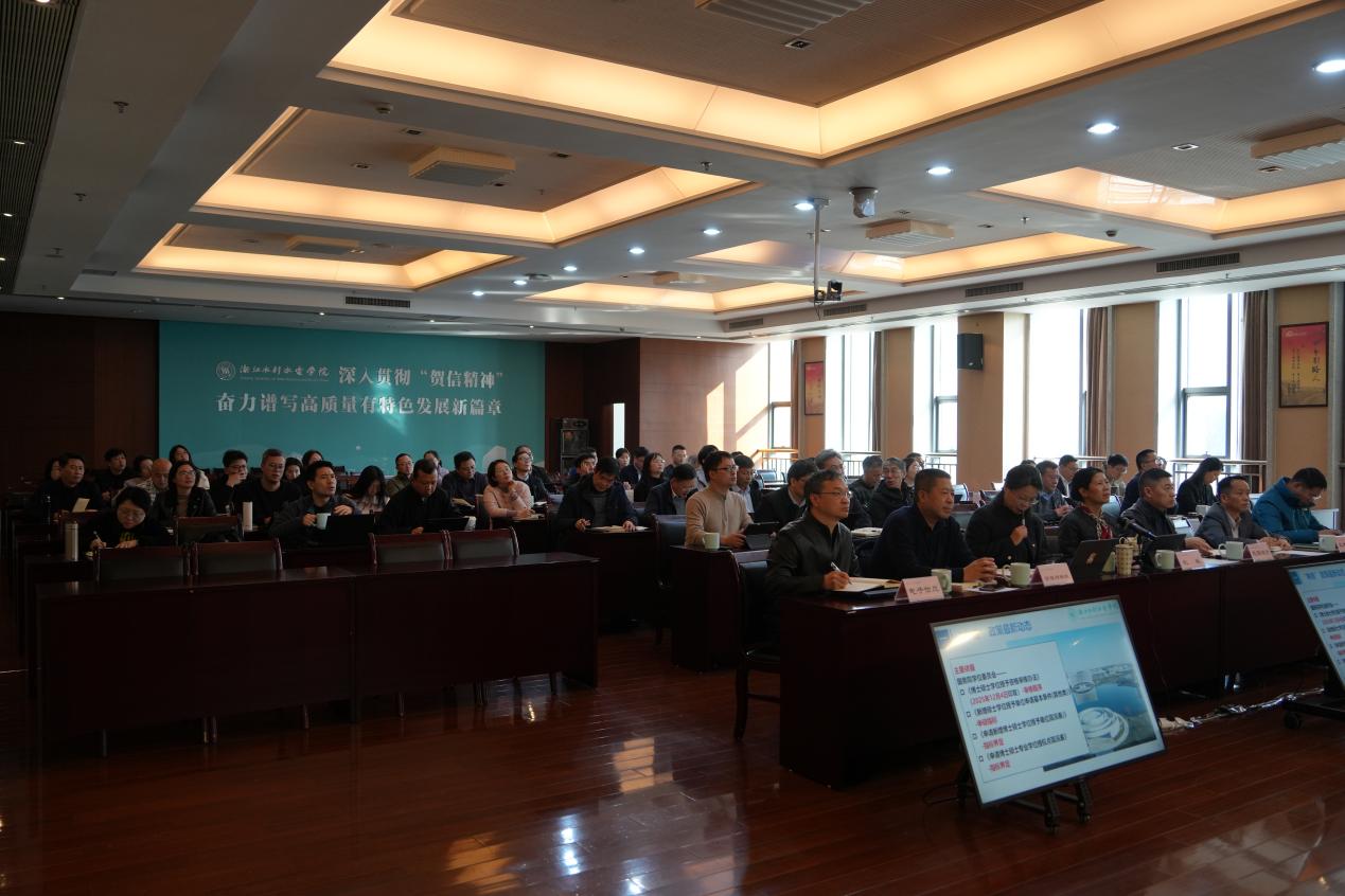 钱天国指出,“申硕”是学校与时俱进深入贯彻“贺信精神”、全面建设高水平应用型大学“三步走”的第一步。近年来,有关部门和二级学院围绕“申硕”目标,做了大量卓有成效的工作。当前,“申硕”已进入最后关头,全校上下要增强信心、鼓足干劲,以决战决胜姿态全面做好“申硕”各项工作。钱天国强调,要对标对表、精准申报,确保申报材料“准确、一致、关联、完整”,并更具水院辨识度。要压实责任、聚力攻坚,相关部门和二级学院主要负责人必须亲自抓、带头干,全体水院人都要关心、支持和服务“申硕”,全力以赴坚决打赢“十五五”高质量有特色发展开局之战。